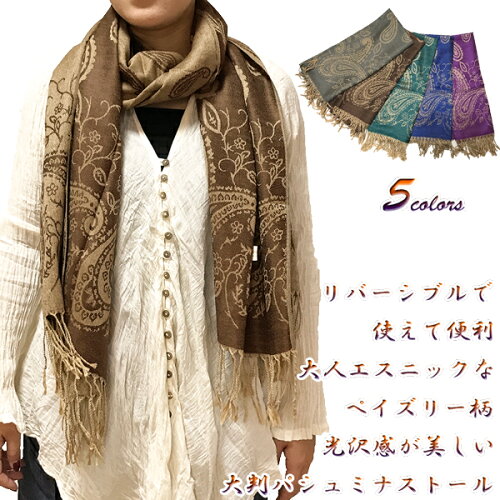 光沢感が美しい高級感漂うジャガード織りペイズリー柄パシュミナストール/リバーシブルで使えます。しっとりしなやかな素材感が魅力/インテリアにも最適/アジアン/エスニック/マフラー/ゆうメール対応アイテム