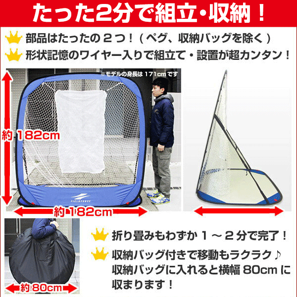 【検索ワード:ラッピング 贈りもの 贈り物 贈物 贈答品 プレゼント ギフト お祝い 記念品 卒業 卒団】プレゼント交換 ギフトボックス】 商品説明 縦横1.8mのビックサイズでもパッと組立ててすぐしまえる"どこでも"バッティングネット! 幅約1.8m×高さ1.8m×奥行1mと大人が使用しても安心なビッグサイズ。