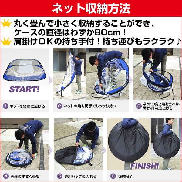 練習後は、丸く畳んで小さく収納することができ、収納ケースの直径はわずか80cm! 肩掛けもできる持ち手付きで、近くの公園や遠征先への持ち運びもラクラク♪